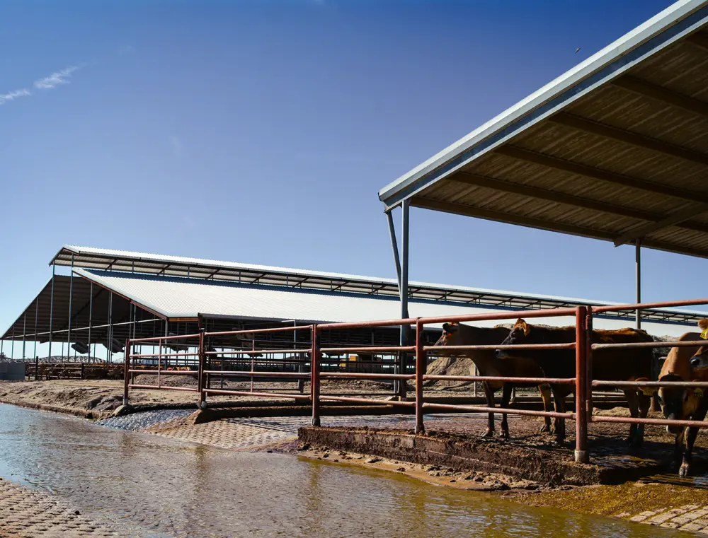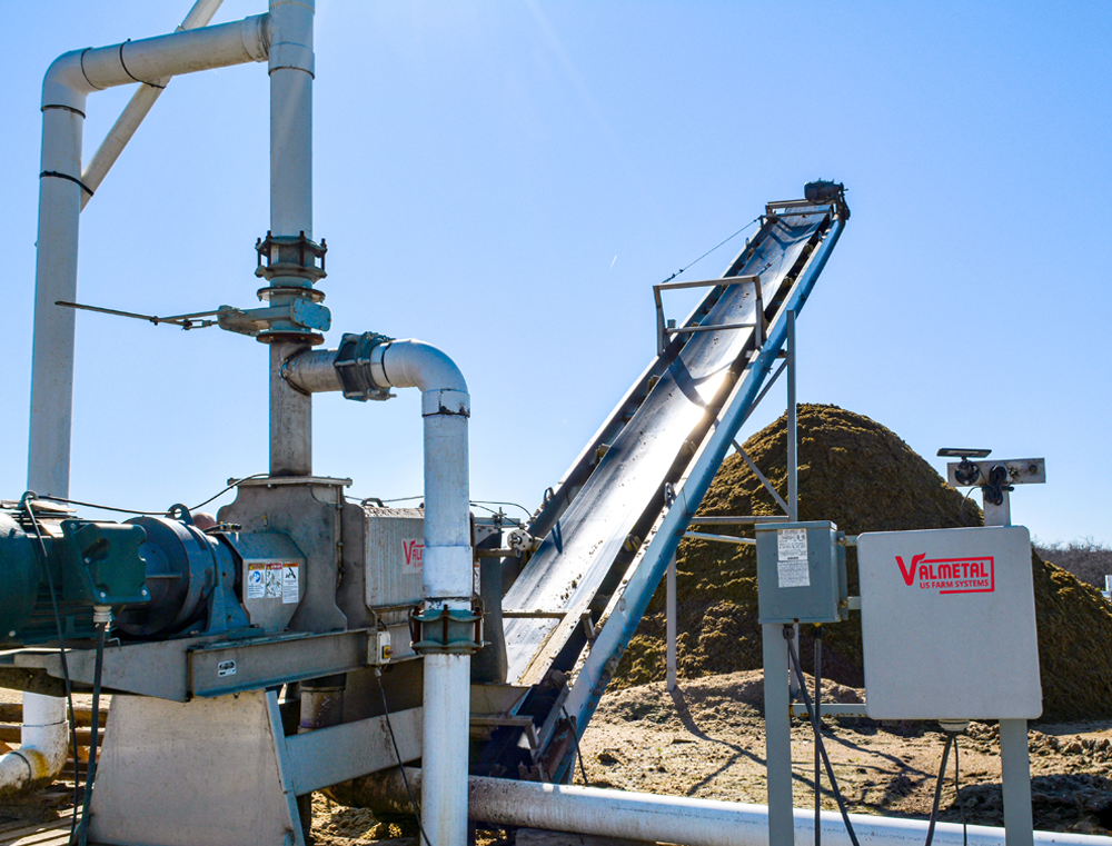 At Four J Farms, recycled manure and bedding are flushed from the alleys using a flushing system. A system of pumps, agitator and separator then processes the material to extract as much liquid as possible, which is then sent to a digester located 1.6 km (1 mile) from the farm. After digestion, the material is returned to the facilities for additional pumping. That is what we call a closed-circuit system.