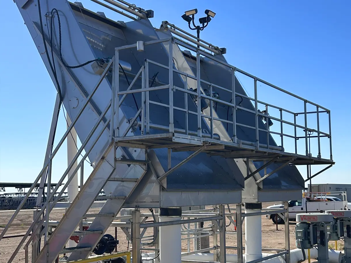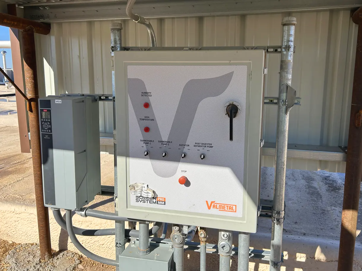 The facility includes an anaerobic digester (DVO) with a capacity of about 611,520 cubic feet (≈ 4.57 million gallons), converting manure into renewable energy. The process relies on extensive manure and wastewater management infrastructure on sand bedding, including thickening and equalization pits, two 8' × 12' curved sloped screen separators equipped with automatic high-pressure cleaning systems, as well as multiple pumps and agitators.